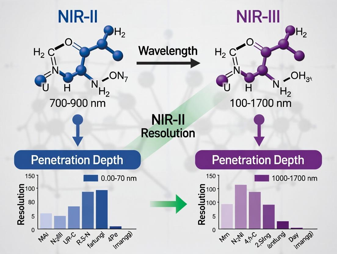 Within the advancing field of biomedical optical imaging, the choice of spectral window is paramount for achieving deep tissue penetration and high-resolution imaging. This guide compares the performance of two near-infrared (NIR) windows—NIR-II (1000-1350 nm) and NIR-III (1500-1850 nm)—with a focus on how longer wavelengths within these windows reduce photon scattering, thereby enhancing penetration depth. The core thesis is that while both windows offer advantages over traditional NIR-I (700-900 nm) imaging, the longer wavelengths of the NIR-III region can further minimize scattering, albeit with trade-offs in detector sensitivity and water absorption.
